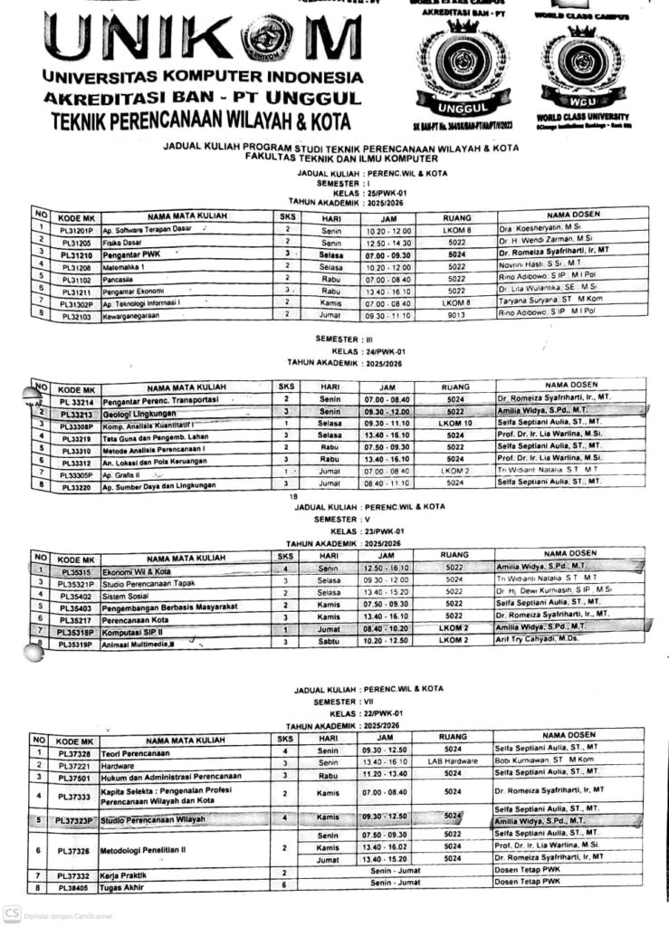 JADWAL KULIAH PROGRAM STUDI PERENCANAAN WILAYAH DAN KOTA